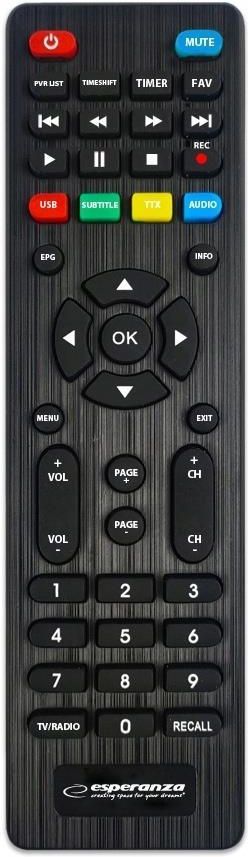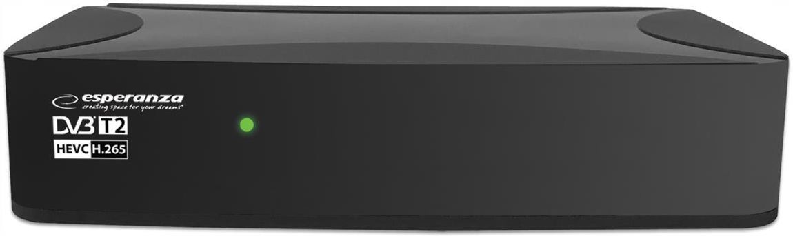 Dekoder TUNER TV NAZIEMNEJ HD DVB-T2 HEVC H.265 SCART HDMI USB + PILOT Najnowsza, nowoczesna wersja dekodera naziemnej telewizji cyfrowej DVB-T/T2 marki Esperanza. Umożliwia odbiór bezpłatnej naziemnej telewizji cyfrowej wysokiej rozdzielczości w standardzie MPEG-2, MPEG-4 H.264/AVC i H.265/HEVC. Odtwarza dźwięk zgodny z MPEG-1 (Layer 1,2,3) AAC, E-AC3. Posiada wbudowaną funkcję nagrywania programów (Personal Video Recording) w cyfrowej jakości z możliwością opóźnionego odtwarzania (Timeshift). Wszystkie funkcję są łatwo dostępne w Menu i bezpośrednio z funkcjonalnego pilota. Dekoder został wyposażony w gniazdo USB, umożliwiające podłączenie zewnętrznych nośników pamięci i nagrywanie lub odtwarzanie z nich plików oraz zdjęć. Posiada wbudowane gniazdo SCART i HD OUT (HDMI) dzięki czemu współpracuje z większością odbiorników TV dostępnych na rynku.Oglądaj więcej, nagrywaj wygodniej, korzystaj wszechstronniej WYSOKA ROZDZIELCZOŚĆ OBRAZU SZEROKA KOMPATYBILNOŚĆ WBUDOWANA FUNKCJA NAGRYWANIACechy i zawartość zestawu:- Zgodność ze standardami: E-AC3, MPEG-2, MPEG-4 H.264/AVC, H.265/HEVC