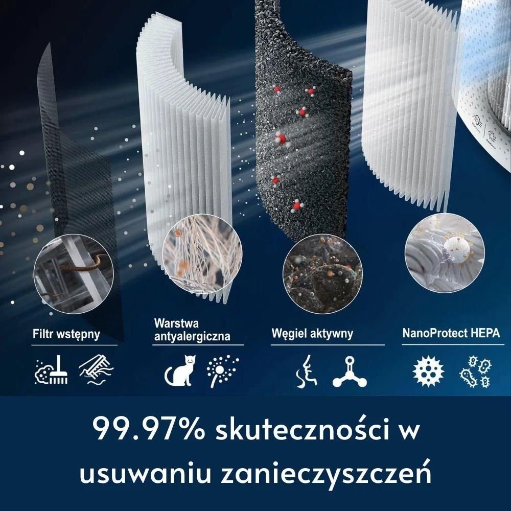 Philips AC3737/10 oczyszczacz powietrza Oczyszczacz i nawilżacz powietrza 2w1 firmy Philips: doskonała wydajność i łatwość obsługi. Jednocześnie oczyszcza i nawilża powietrze. Oczyszcza duże pomieszczenia, eliminując 99,97% zanieczyszczeń i 99,9% formaldehydu. Po zdjęciu zbiornika wody może działać tylko jako oczyszczacz. Zawsze zdrowsze powietrze Czyste powietrze i idealna wilgotność na wyciągnięcie ręki Oczyszcza pomieszczenia o pow. do 131 m2 CADR: 505 m3/h, wydajność nawilżania: 650 ml/h Usuwa formaldehyd Połączenie z Wi-Fi, aplikacja Air+ Dokładnie oczyszcza pomieszczenia o powierzchni do 131 m2(2) Urządzenie doprowadza czyste powietrze do każdego zakątka pomieszczenia przy współczynniku CADR (współczynnik dostarczania czystego powietrza) równym 505 m3/godz. Dokładnie oczyszcza nawet duże pomieszczenia o powierzchni do 131 m2(2), chroniąc Cię przez bakteriami, wirusami, pyłkami, kurzem, łupieżem zwierzęcym, roztoczami, szkodliwymi gazami (takimi jak formaldehyd), zapachami i innymi zanieczyszczeniami. Usuwa 99.97% niewidocznych cząsteczek z powietrza Oczyszczacze powietrza Philips są jako jedyne wyposażone w filtr NanoProtect HEPA z aktywnym filtrem węglowym i filtrem wstępnym, które pozwalają usunąć 99,97% cząsteczek wielkości zaledwie 0,003 mikrona. Technologia NanoProtect HEPA nie tylko wyłapuje zanieczyszczenia, ale także, dzięki ładunkom elektrostatycznym, przyciąga je, oczyszczając dwa razy większą objętość powietrza niż tradycyjny filtr HEPA H13 i zapewniając wyższą wydajność energetyczną. Automatyczne nawilżanie do 650 ml/h z 4 ustawieniami Szybkie nawilżanie (...) więcej o wydajności do 650 ml/h. Urządzenie wykrywa i automatycznie dostosowuje poziom wilgotności do Twoich wymagań. Funkcja nawilżania włącza się i wyłącza zależnie od potrzeb, aby zapewnić pożądany poziom wilgotności. AeraSense dokładnie wyczuwa i wyświetla jakość powietrza Profesjonalny czujnik AeraSense bada powietrze 1000× na sekundę pod kątem obecności groźnych zanieczyszczeń i inteligentnie dobiera optymalne ustawienia. Informacje o jakości powietrza — poziom alergenów, pyłów zawieszonych PM2,5 oraz wilgotności — wskazywane są w czasie rzeczywistym. Technologia NanoCloud: higieniczne nawilżanie bez bakterii Technologia NanoCloud usuwa nawet do 99% bakterii w porównaniu z nawilżaczami ultradźwiękowymi(6). Poprzez naturalny proces parowania tworzy niewidzialną mgiełkę nanocząsteczek pary wodnej, co zapobiega rozprzestrzenianiu się bakterii i białego pyłu w pomieszczeniu. Usuwa szkodliwe gazy, takie jak formaldehyd, NH3, H2S i LZO Filtr został udoskonalony poprzez dodanie specjalnie zmodyfikowanej warstwy węgla aktywnego. System filtracji rozkłada formaldehyd na niegroźne substancje w mniej niż 0,1 s. Usuwa 99,9% formaldehydu dzięki wysokiemu współczynnikowi FCADR wynoszącemu 335 m3/h(6), co jest wynikiem 10-krotnie lepszym w porównaniu z rozwiązaniami bez specjalnych modyfikacji. Co więcej, skutecznie eliminuje również szkodliwe gazy takie jak amoniak (NH3), siarkowodór (H2S) oraz LZO, które są odpowiedzialne za nieprzyjemne zapachy (np. przykre zapachy zwierząt, ludzkiego ciała oraz z łazienki). Udowodniona skuteczność usuwania wirusów H1N1 i ludzkiego koronawirusa E229 Wyłapuje aerozole, w tym aerozole mogące zawierać wirusy wywołujące zakażenie dróg oddechowych. Testy przeprowadzane przez niezależne laboratorium wykazały, że usuwa do 99% bakterii i wirusów, takich jak H1N1, HCoV-229E oraz EV71. Tryb nocny z bardzo cichym działaniem W trybie nocnym urządzenie automatycznie wyłącza wyświetlacz oraz kontrolki i wytwarza dźwięk o natężeniu zaledwie 15dB(A)(8), co czyni je cichszym niż szept. W trybie automatycznym urządzenie inteligentnie dostosowuje swoją pracę, aby utrzymywać poziom hałasu na minimalnym poziomie. Zdejmowany 4-litrowy zbiornik wody ułatwia zmianę trybu pracy Bezproblemowe przechodzenie między trybami 2w1 i tylko oczyszczania poprzez zdejmowanie i zakładanie zbiornika wody na jednostkę oczyszczającą. Zbiornik wody został stworzony z myślą o łatwości użytkowania, a pojemność 4L sprawia, że nie trzeba go tak często napełniać. Ponowne napełnianie wodą jest proste — wodę można wlać od góry, bez otwierania pokrywy. Aplikacja Philips Air+: inteligentne rozwiązanie zapewniające czyste powietrze Aplikacja Air+ zapewnia powiew czystego, zdrowego powietrza. Śledząc w czasie rzeczywistym jakość powietrza w domu i na zewnątrz, pozwala Ci dostosować parametry urządzenia za pomocą cyfrowego pilota zdalnego sterowania oraz inteligentnej funkcji planowania — niezależnie od tego, gdzie jesteś. Niskie zużycie energii Dzięki energooszczędnej konstrukcji zużywa maksymalnie 42W do oczyszczania i nawilżania powietrza. czyli mniej niż tradycyjna żarówka. W trybie automatycznym silnik pracuje wyłącznie wtedy, gdy jest to potrzebne, co wydłuża żywotność filtra i oszczędza energię. Dokładnie przetestowane pod kątem jakości, której możesz zaufać Oczyszczacze firmy Philips przechodzą 170 obowiązkowych i rygorystycznych testów kontrolnych przed ich wprowadzeniem na rynek. Są poddawane szczegółowym testom działania i trwałości, które umożliwiają ciągłą pracę przez 24 godziny na dobę, 7 dni w tygodniu. mniejPHILIPS Seria 3000 AC3737/10 - Opinie i recenzje