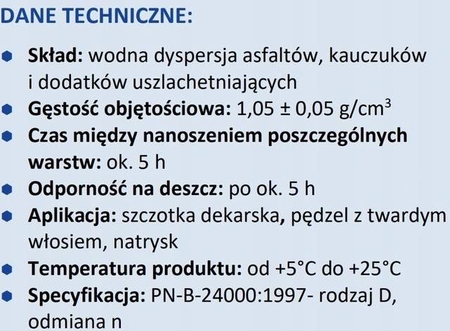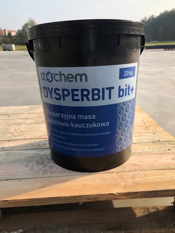 IZOCHEM DYSPERBIT BIT - 20 KGIzochem Dysperbit BIT+ to gotowa do użycia wodna dyspersja asfaltowo-kauczukowa, modyfikowana za pomocą SBS, co zapewnia wyjątkowe właściwości. Jest bezpieczny w kontakcie ze styropianem, co pozwala na jego stosowanie w różnych warunkach budowlanych. Można go aplikować na suche i lekko wilgotne podłoża, co zwiększa elastyczność użycia. Charakteryzuje się wysoką zawartością asfaltu, co przekłada się na lepsze właściwości uszczelniające. Dzięki tiksotropowej konsystencji, produkt nie spływa z powierzchni pionowych, co ułatwia aplikację. Jest również odporny na działanie czynników atmosferycznych, co gwarantuje długotrwałą ochronę i trwałość.Zużycie: około 1,5 kg / m2 / 1 mm grubości Temperatura stosowania: Od +5 °C do +25 °CMetoda nakładania: szczotka dekarska, pędzel z twardym włosiem, natrysk Właściwości:✅ bezpieczny w kontakcie ze styropianem ✅ może być stosowany na suche i lekko wilgotne podłoże ✅ modyfikowany SBS ✅ o wysokiej zawartości asfaltu w wyrobie✅ tiksotropowa konsystencja, nie spływa z powierzchni pionowych ✅ odporny na działanie czynników atmosferycznych Izochem Dysperbit BIT jego przeznaczenie to: ✅ wykonywanie izolacji przeciwwilgociowych podziemnych części budowli i posadzek na gruncie ✅ gruntowanie podłoży po rozcieńczeniu wodą od 1:1 do 1:2✅ wykonywanie bezspoinowych pokryć dachowych zbrojonych tkaninami technicznymi ✅ renowacja i konserwacja pokryć dachowych✅ wykonywanie bezspoinowych pokryć dachowych na podkładzie z jednej warstwy papy Sposób (...) więcej użycia:1️⃣ Podłoże powinno być czyste, suche lub matowo - wilgotne, gładkie, oczyszczone z tłuszczu, luźnych powłok, nacieków i innych substancji zmniejszających przyczepność. 2️⃣ Ściany fundamentowe powinny być otynkowane, a nowe tynki i betony wysezonowane. Podłoże nie może być zmrożone, oszronione, musi być pozbawione zastoin wody. W przypadku renowacji pokryć papowych usunąć luźne fragmenty papy i inne zanieczyszczenia. Istniejące pęcherze i/lub wybrzuszenia na papie przeciąć na krzyż i podkleić stosując IZOCHEM ROS REPERATOR/IZOCHEM RLP. 3️⃣ Podłoże zagruntować rozcieńczonym wodą IZOCHEM DYSPERBIT bit+ w proporcji 1:1 do 1:2 (w zależności od chłonności podłoża).Izolacja podziemnych części budowli i posadzek na gruncie:1️⃣ Po aplikacji należy poczekać, aż warstwa gruntująca całkowicie wyschnie.2️⃣ Następnie nanosić masę bez rozcieńczania w co najmniej dwóch warstwach, z każdą operacją wykonaną po wyschnięciu poprzedniej, aby osiągnąć minimalną grubość suchej pozostałości wynoszącą 1 mm.Konserwacja i renowacja pokryć dachowych:1️⃣ Nanosić co najmniej dwie warstwy masy na całą powierzchnię dachową, każdą następną po wyschnięciu poprzedniej. 2️⃣ W miejscach styków połaci dachowej z kominem, przy kanałach i kominach wentylacyjnych, wtopić tkaninę zbrojącą, wywijając ją na odpowiednią wysokość.3️⃣ Dla wydłużenia żywotności powłoki, ostatnią świeżą warstwę masy zaleca się posypać posypką mineralną.Wykonywanie bezspoinowych pokryć dachowych:1️⃣ Rozprowadzić IZOCHEM DYSPERBIT bit+ pasami o szerokości zbliżonej do szerokości tkaniny zbrojącej.2️⃣ Na rozprowadzonej świeżej warstwie wtopić włókninę polipropylenową o gramaturze 60 g/m^2, dokładnie dociskając. Grubość jednej warstwy nie powinna przekraczać 1 mm (optymalnie 0,6-0,7 mm).3️⃣ Zakłady tkaniny powinny mieć szerokość min. 10 cm dla wkładek do 6m długości i ok. 20 cm dla dłuższych.4️⃣ Rozprowadzić wystarczającą ilość masy, by uzyskać całkowite nasycenie tkaniny.5️⃣ Prace na warstwie zbrojonej kontynuować nie wcześniej niż dnia następnego.6️⃣ Nałożyć warstwę nasycającą włókninę, a po wysuszeniu - warstwę masy asfaltowej. Na jeszcze mokrą masę wtopić tkaninę polipropylenową siatkową o gramaturze 48 g/m^2, postępując analogicznie jak przy pierwszej tkaninie, z zachowaniem zasady mijankowości spoin. mniejDysperbit Bit+ wzbogacany SBS-em dach fundament 20 - Opinie i recenzje