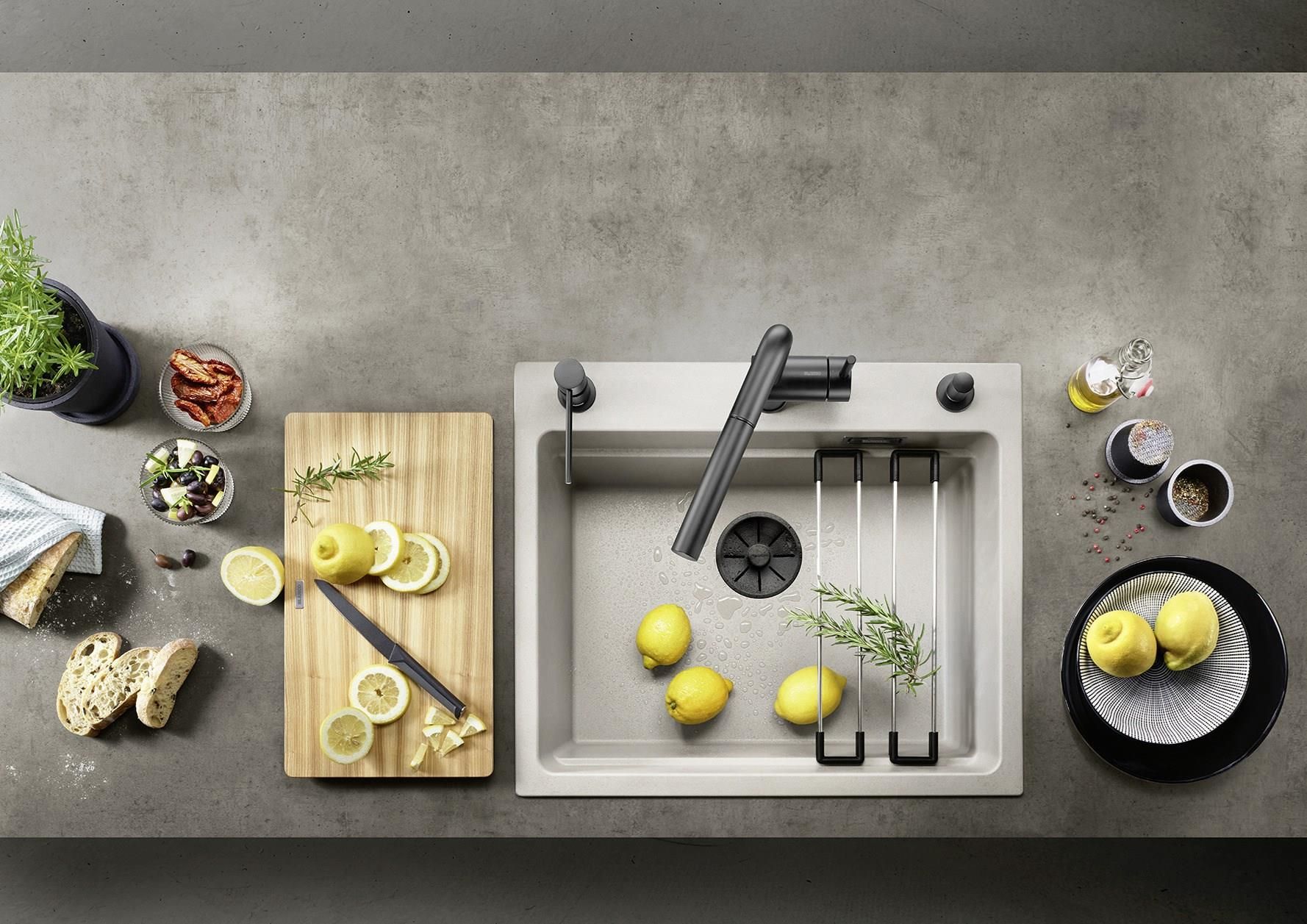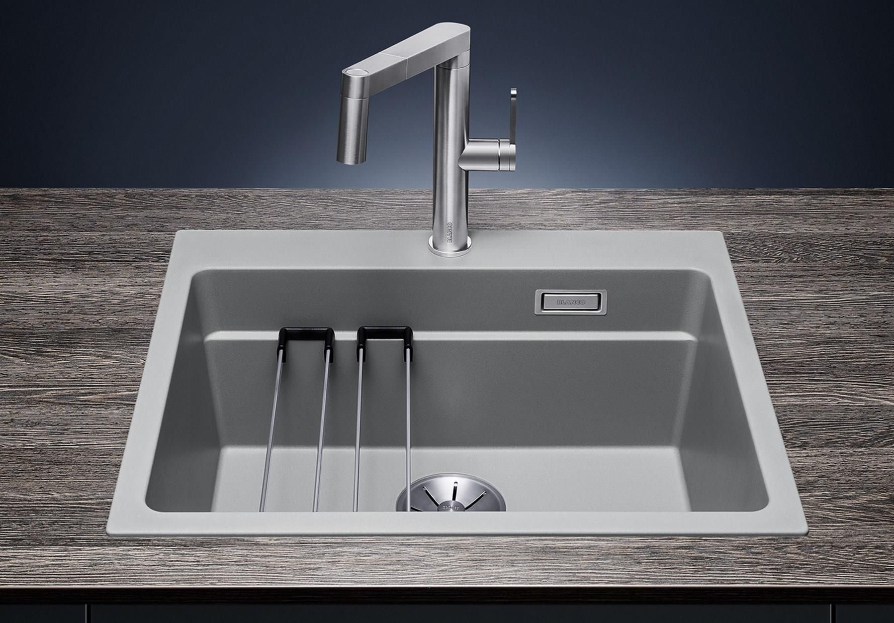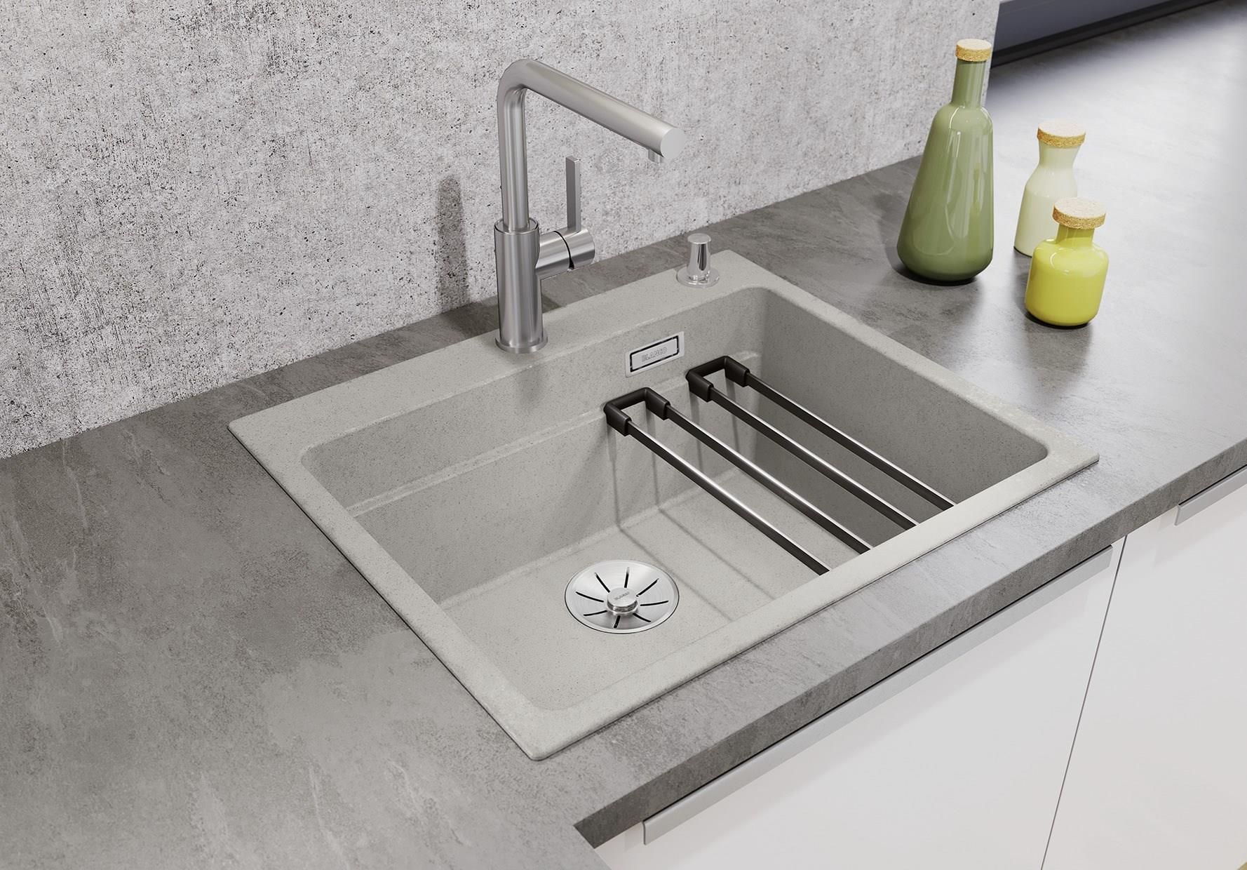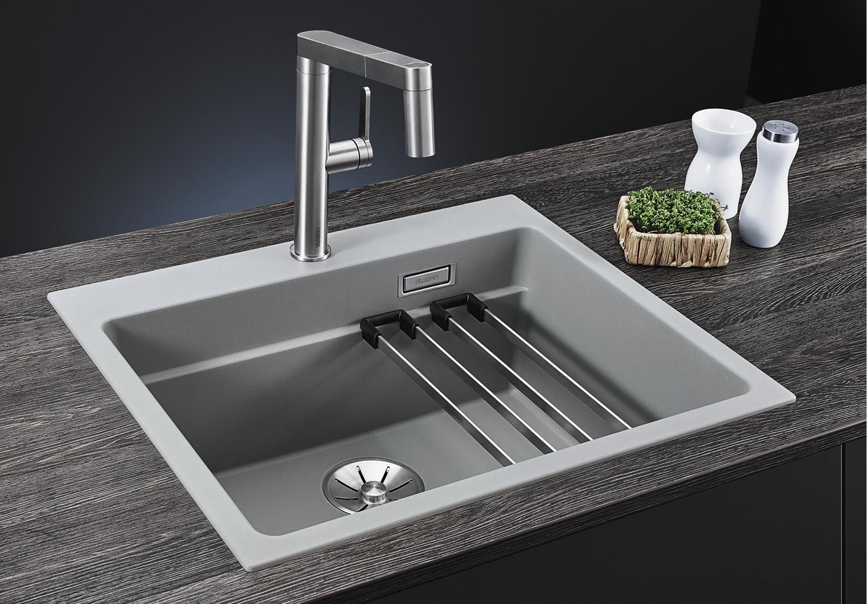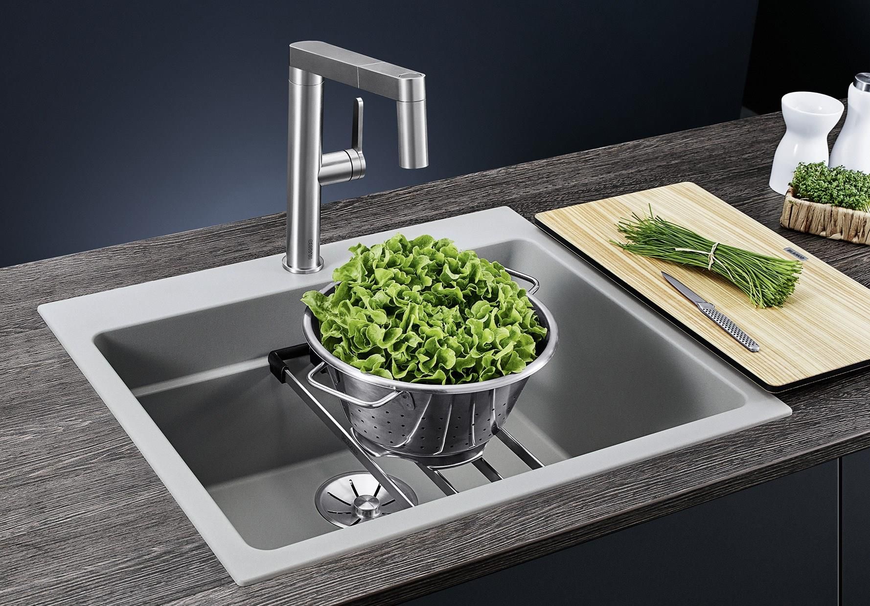 BLANCO ETAGON SILGRANITBLANCO ETAGON to wyjątkowy zlewozmywak posiadający wewnątrz komory wyprofilowaną krawędź, na której można oprzeć bardzo stabilne szyny ze stali szlachetnej. Na takich szynach postawimy np. pojemniki, garnki lub patelnie. Warzywa pokrojone na desce do krojenia, opartej na krawędzi komory, łatwo zsuniemy bezpośrednio do naczynia ustawionego na szynach w komorze. Dzięki temu zyskujemy dodatkowy funkcjonalny poziom, a zwykła pojedyncza komora staje się samowystarczalnym centrum kuchennym. Do tego modelu zlewozmywaka można dobrać praktyczną narożną odsączarkę, przenośny ociekacz i deskę do krojenia, która po zakryciu nią komory będzie stanowiła przedłużenie zlewozmywaka. BLANCO Etagon jest dostępny w wielu wariantach kolorystycznych w opcji z Silgranitu, a także w 4 kolorach w ceramice oraz w wersji ze stali szlachetnej., Genialne rozwiązanie: piętrowa komora